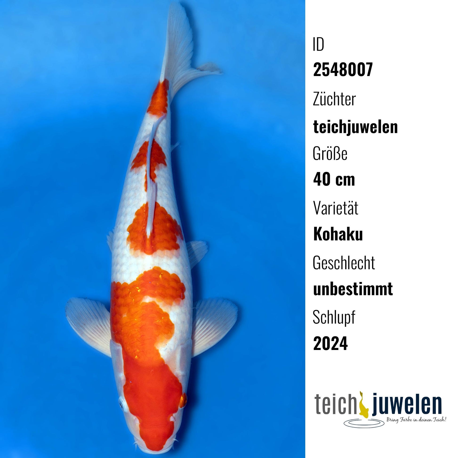 Ebenfalls ein ordentlich großer, mit sehr solider Qualität ausgestatteter Kohaku aus der BigBoy Linie. Dieser Fisch lebt von seiner Zeichnung und dem starken Rot Weiß Kontrast. Sofern er seine Qualität noch einige Jahre weiter halten kann, ist dieser Fisch ein wahres Juwel im Teich.